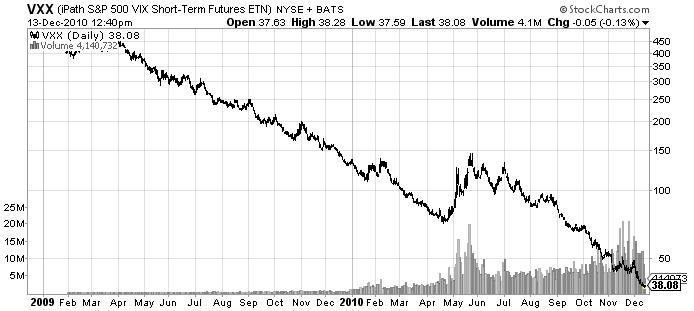 Además ir vendido de volatilidad tiene una ventaja, que es que en circunstancias normales habrá contango y por tanto se cobra el rollover cada mes y esa es la razón por la que ETNs como el VXX se hunda y se hunda cada día más en el infierno: