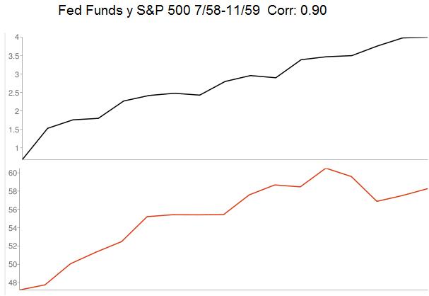 Las evidencias desde 1957 (tan lejos como tengo datos) demuestran que una subida de tipos normalmente es propio de un mercado alcista. Los datos se refieren a los principales ciclos de subidas de tipos desde el valle hasta el pico en base mensual.