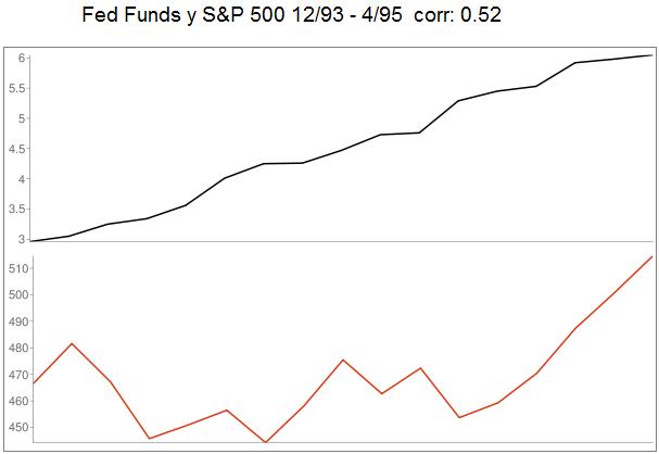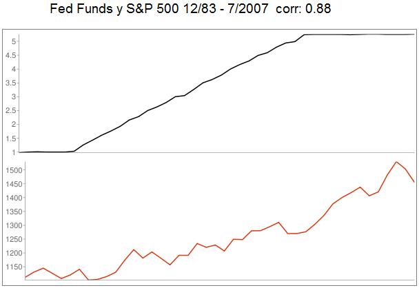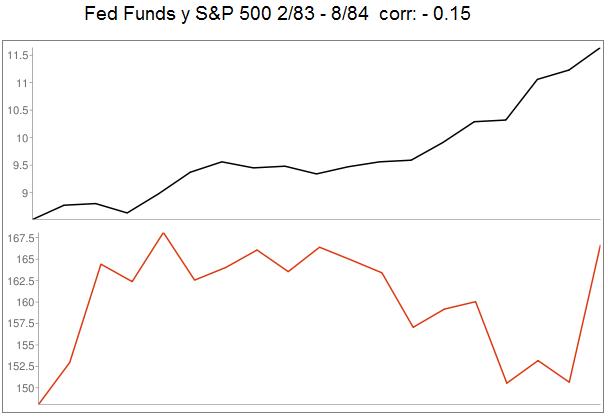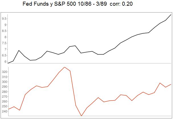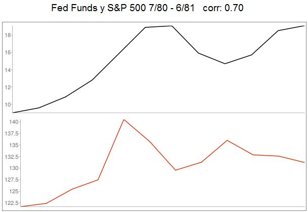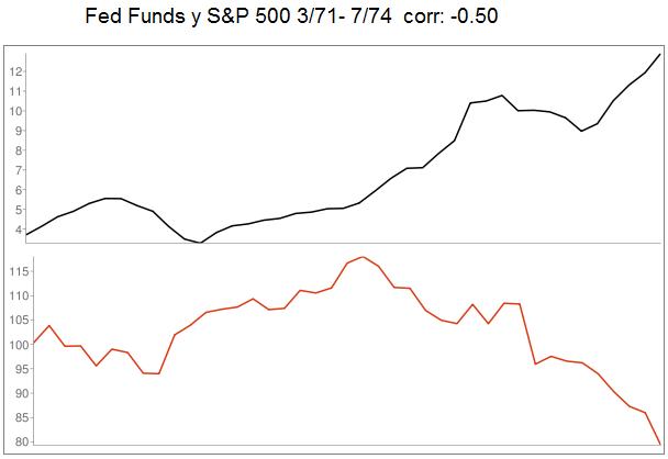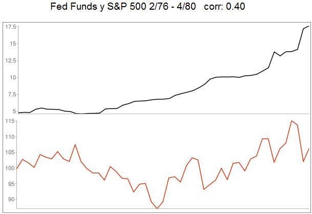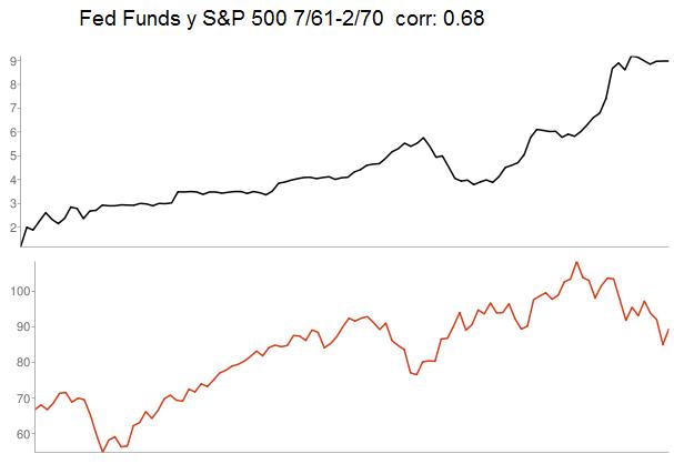 Vemos que sólo en el ciclo 1971 a 1974 hubo una clara correlación negativa en ese periodo. Quitando ese ciclo, los demás ciclos podrían dividirse entre débil correlación y otro grupo de fuerte correlación. En cualquier caso nada sugiere que tipos al alza es malo para la bolsa, sino todo lo contrario.
