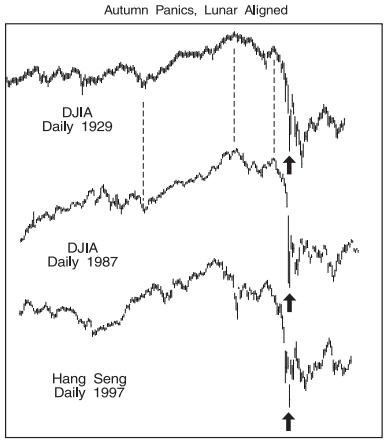 Volviendo al efecto lunar en los grandes pánicos de otoño. En el siglo XIX y principios del XX se creía que los pánicos de Octubre eran ocasionados por una posición débil de caja de los bancos tras pagar a los agricultores. Sin embargo los pánicos de otoño se siguen produciendo ahora que la agricultura es una parte ínfima de la economía.