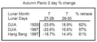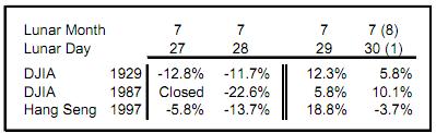 El autor señala que los pánicos de 1929, 1987, 1997 (Asia) y 2008 (añado yo) ocurrieron en la misma fecha del calendario solar lunar. Exactamente el dia 28 de la séptima luna. Se señala con una flecha el día.