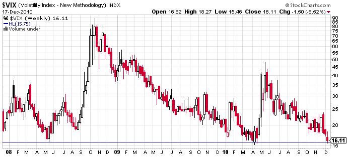 El índice VIX cerró el viernes en 16.11 o lo que es lo mismo la zona aproximada del soporte que ha marcado las lecturas más bajas del índice en abril de 2010 (antes del flash crash) y en mayo de 2008 (antes del infame crash).