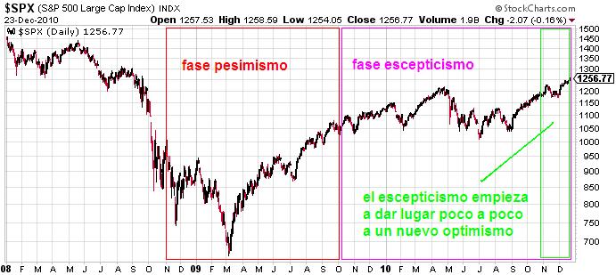 Si uno toma periódicos y lee las noticias de los medio on-line (no aporto ninguna imagen pero le recomiendo observe las noticias), ve que lo que abunda ahora mismo son por un lado aquéllos que dicen cosas como "los osos estaban equivocados" y la de aquéllos que siguen en pensando en una línea muy pesimista para el 2011 y proclaman un futuro año no muy bueno. Lo que está claro es que no hay unanimidad y lo que yo veo claro es que los escépticos son muchos pero menos que hace 6 meses y los nuevos optimistas empiezan a ser más y se rinden a la evidencia.