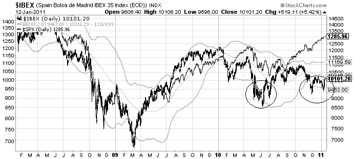 A este potencial movimiento al alza del euro, parece que el Ibex, y por extensión los países europeriféricos estarían en armonía con un movimiento al alza del euro, castigado, sin duda, por los temores de la deuda europea.