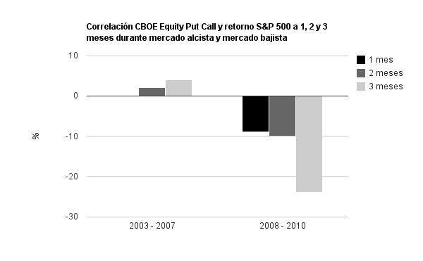 Como se observa, mientras que el ratio mantiene cierta correlación negativa con los retornos del S&P 500 durante la fase bajista (2008-2010), en el mercado alcista (2003-2007) la correlación es prácticamente nula. Es decir, este ratio, en el mejor de los casos es útil durante una tendencia bajista, por tanto, previamente necesitamos saber en que tendencia estamos, de lo contrario puede llevarnos a una profunda confusión.