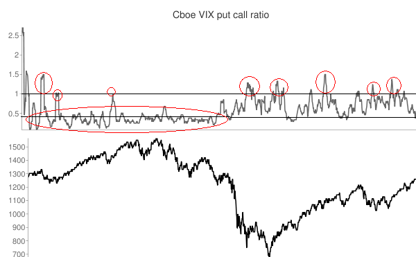 CBOE VIX Put Call Ratio: Este ratio basado en las opciones negociadas del índice de volatilidad VIX tiene una mayor correlación negativa con los retornos del mercado, que el ratio CBOE equity. Veamos si niveles absolutos de este ratio tienen algún valor predictivo para los techos de mercado.