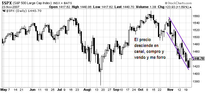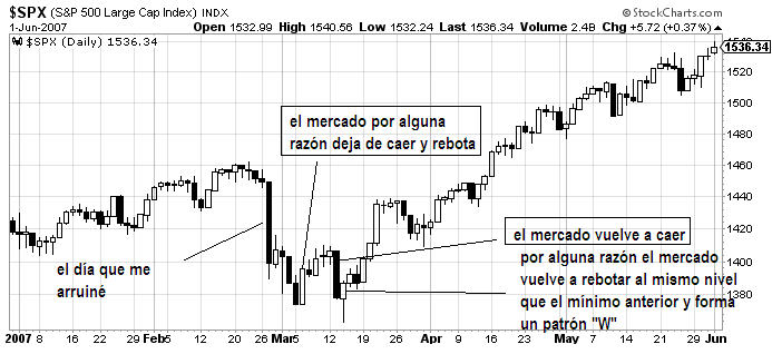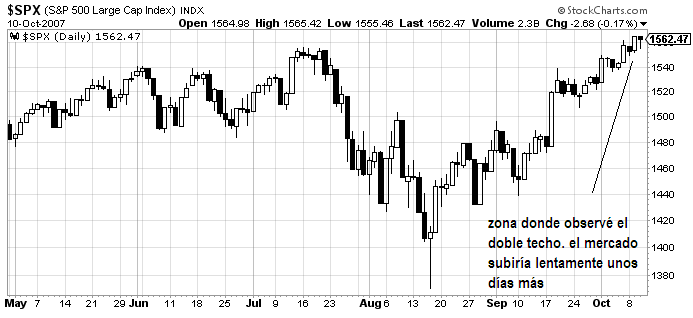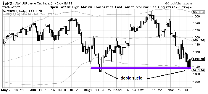 Un día, el mercado llegó a la parte baja del rango. Muy aproximadamente a la altura donde en agosto de ese mismo año había previsto que era un suelo, y que se demostró a la postré que tenía razón. Entonces lo ví claro: doble suelo de nuevo ¡¡esto está chupado¡¡ el mercado está formado por dobles suelos. Dobles suelos por aquí y dobles suelos por allá.