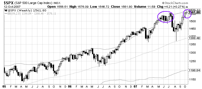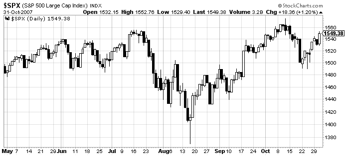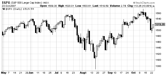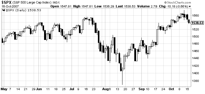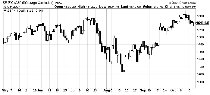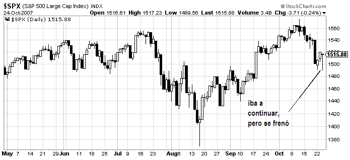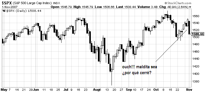 El 19 de octubre de 2007 el día empezó con debilidad para las bolsas. Cuando el precio rompió el mínimo de la mecha de la vela anterior me decidí a entrar....y el precio cayó, cayó y cayó. ¡¡No paraba de caer y yo iba corto de futuros¡¡ Iba cargado hasta los dientes. Todo el arsenal. En apenas unas horas había convertido mis 15,000 euros en 30,000 euros. Si señor ¡¡era mi hora¡¡ y lo mejor de todo es que el precio iba a caer 100 puntos más y haría un pastizal. ¿Tal vez 100,000 si metía más futuros? ¿Quién sabe? estaba de racha, así que la cuestión era aguantar la posición. Todos esos puntos de caída me daban un buen colchón de margen para que el precio no volviera. Lo que más me fascinó de ese día era que fue el 20 aniversario del crash de 1987 y los titulares de los periodicos eran algo como esto: "Wall Street celebra el 20 aniversario de 1987 con fuertes caídas". ¿Era posible que el mercado "celebrara" cosas? ¿Eran válidos este tipo de argumentos? ¿Es posible que la psicologìa de masas funcione así?