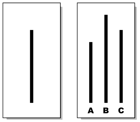 Se reunía a un grupo de 7 a 9 estudiantes en un aula. El experimentador explicaba que a continuación se les exhibirían algunas líneas que diferirían en longitud y que su tarea sería señalar con cuál de las líneas de comparación que se les presentaban coincidía la línea original. Cada sujeto, uno por uno, debería ir mencionando qué línea de entre las tres juzgaba igual que la estándar realizándose un total de 12 ensayos.