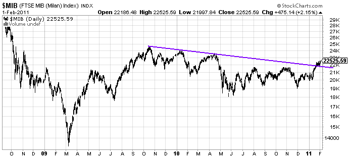 Como se observa, la bolsa de Milán anda rompiendo una línea muy evidente. Se pueden intentar largos muy agresivos. Ahora mismo, de todos los países europeriféricos es el que me resulta más interesante, tanto por su situación técnica como por el emplazamiento del stop ajustado y por ser el país que económicamente mejor anda. Ante la duda, la más tetuda. Un buen ETF para comprar Italia es el que lleva el código EWI. Para estos días es mi apuesta. A ver si funciona de primeras y dejamos la operación abierta unos meses.