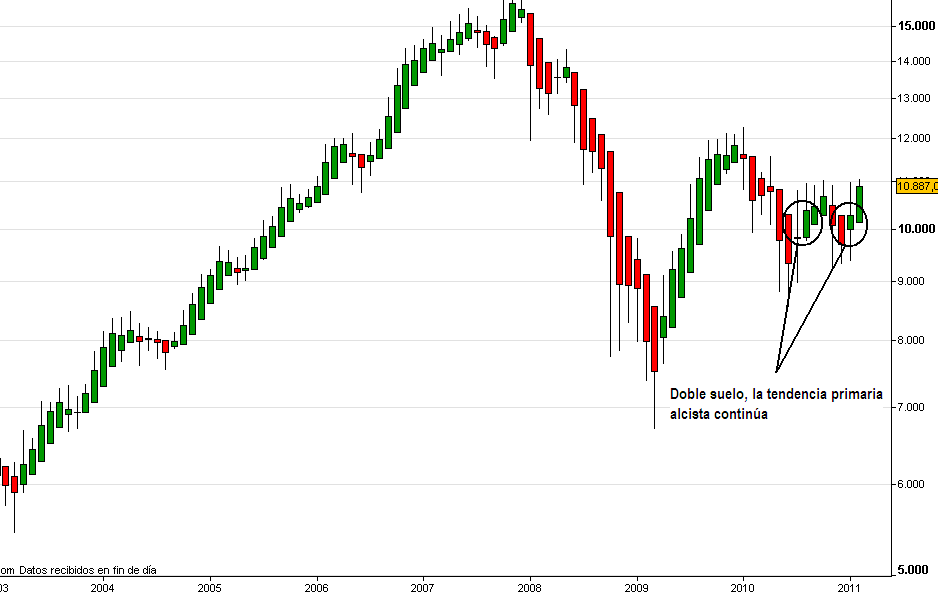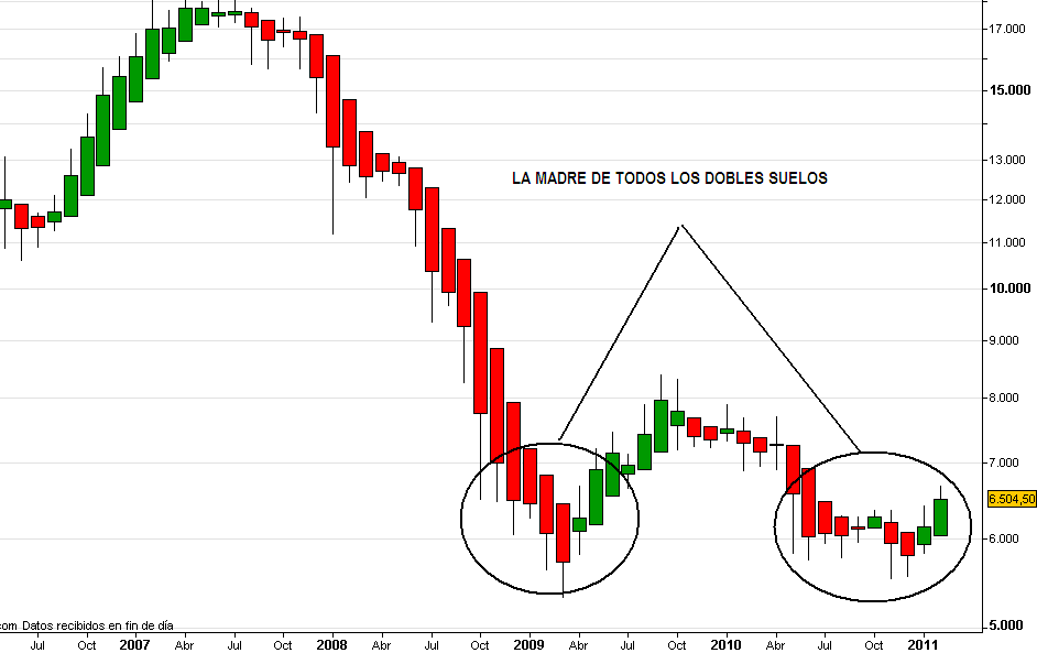 Si ponemos el foco en el Ibex 35, observamos que no ha roto su zona de congestión pero está formando una poderosa estructura alcista y, además, ha dejado un doble suelo que sugiere que podemos estar ante un suelo de largo plazo: