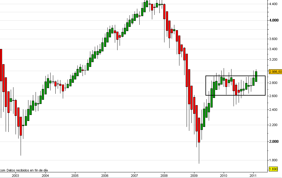 En primer lugar, el índice Eurostoxx 50 está rompiendo la zona de congestión en la que ha transitado durante 19 meses. Es decir está siguiendo la inercia alcista de los índices bursátiles: