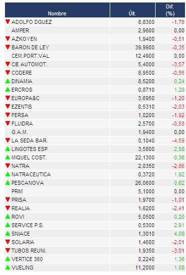 Adolfo Domínguez, Codere, Dinamia, Ercros, Europac, Ezentis, Fluidra, Gamesa, La Seda, Lingotes, Natra, Natraceutica, Pescanova, Realia, Service Point, Sniace, Solaria, Tubos, Vertice, Vueling.