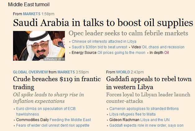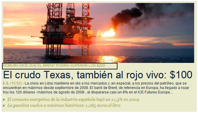Ayer jueves no ha podido llamarme más la atención esta noticia de portada de Cotizalia. Todos estamos al tanto de los acontecimientos de última hora en el despertar de la primavera árabe. Pero hay que recordar que el petroleo es una commodity más. Ya se habla de que Arabia Saudí incrementará el número de barriles a la venta . Que Gadafi esté bombardeando a su pueblo puede tener un efecto puntual en el precio del petróleo, pero dudo que tenga consecuencias de largo alcance.
