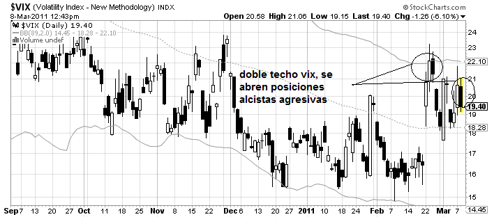 Situación de mercado: el call ratio backspread abierto anteayer de momento pinta bien. Ayer me volví más alcista aún y vendí unos cortos de volatilidad (futuros VIX). No obstante el mercado se ha convertido en un mercado más rápido y es necesario tomar decisiones (y cambiarlas) con mayor frecuencia según se desarrollan los acontecimientos. En los pasados días hemos hecho algunos trades aprovechando rebotes, tal vez ahora haya la posibilidad de un swing alcista de mayor duración. Un Vix por encima de 21 significaria fuera todo (el corto de futuros del vix, ya que el ratio backspread no pasa nada si hay caídas). La idea de fondo es ir a todo lo que parezca un rebote, intentando mantener los riesgos bajos hasta dar el "campanazo" (aunque de momento sin darlo ha ido bastante bien en esta lateralidad)