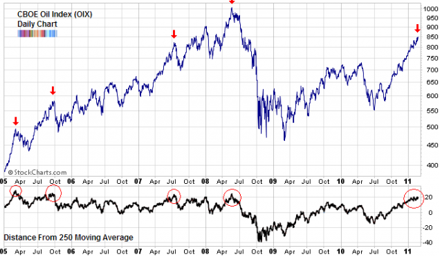 No menos intersante es este gráfico de Trader´s Narrative donde se muestra que cada vez que el OIl se desplazó tanto sobre su media de 250 sesiones, coincidió con un techo importante.