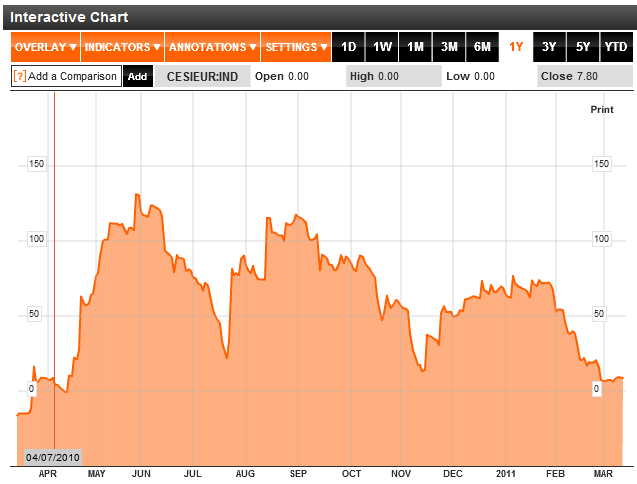 He encontrado un índice que es una maravilla: El economic surprise index. Lo he conocido hoy a través de Alphaville y al verlo me he alegrado mucho porque quería algo así hace tiempo. Lo que mide el índice son las sorpresas al alza o a la baja de los datos económicos, según regiones. Ahora mismo tendríamos el americano muy alto, indicando que los últimos datos han sido con sorpresas positivas (best than expected). Este, a continuación es sobre Europa. Ultimamente no ha habido sorpresas positivas sino negativas. Fíjense que los últimos mínimos en el pasado año han coincidido con suelos de mercado. Por supuesto este índice puede caer más y lo acabo de conocer. Pero estaré muy atento a él pues creo puede ser una herramienta extraordinaria. ¿La siguiente ola de sorpresas serán negativas o positivas? Yo no lo sé, pero gracias a este gráfico vamos a ir comprobándolo. He puesto el enlace (Europa y América en la zona de mis enlaces).