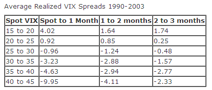 Aquí tenemos una tabla con las primas y descuentos promedio de los futuros con respecto al VIX para el periodo 1991-2003: