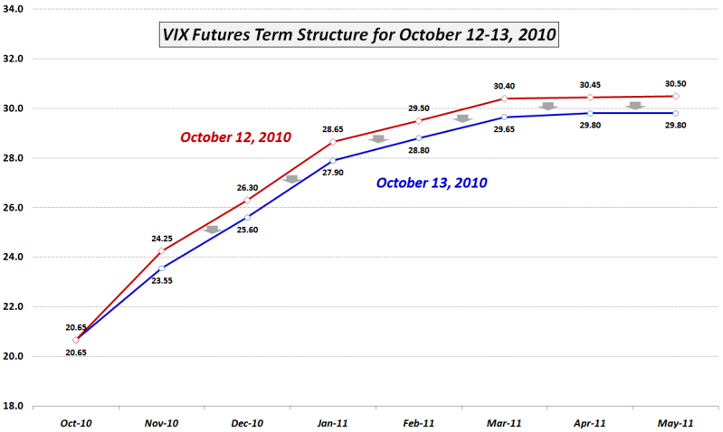 Vemos la curva de futuros del VIx para el día 12 de octubre y para el día 13. En concreto, esta curva pasó de un mayor contango a uno menor.