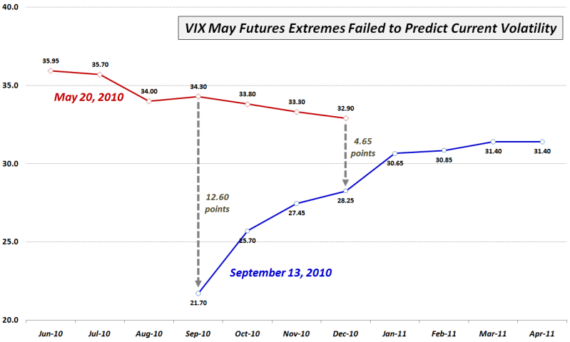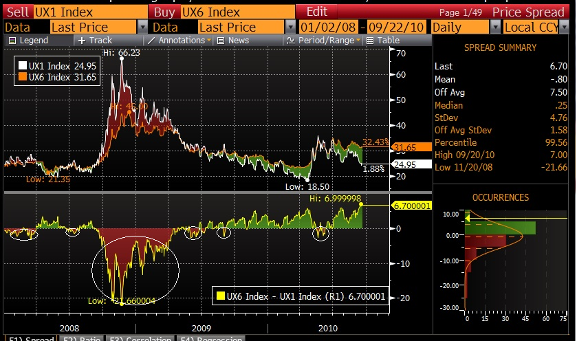 Observamos que la curva de futuros está en fuerte backwardation hasta verano de 2011 (recuadro). Por tanto, por todo lo dicho anteriormente, es un momento óptimo para comprar XVIX.