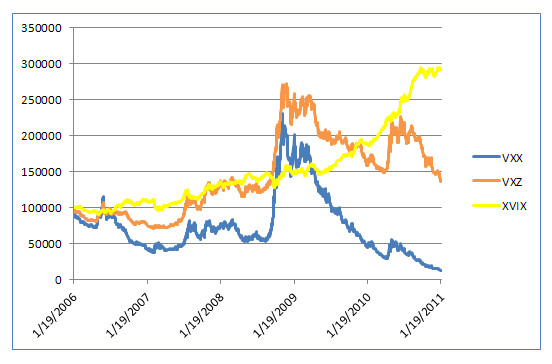 En esta imagen se ve la relación de todos los elementos. Si entendemos VXX como futuro de vencimiento más cercano y VXZ como futuro de vencimiento más lejano y vendemos 0.5 de VXX y compramos 1 de VXZ tendríamos XVIX. Como se ve, la gran crisis de 2008 hizo que este spread se comportara muy bien en los momentos de mayor crisis. Bajó un poco, pero desde el momento en que VXX y VXZ hicieron techo, entonces el VXX empezó a bajar más rapido en relación a VXZ creando un beneficio bestial para XVIX. Lo mismo ocurrió en mayo de 2010. Es tras una gran crisis cuando este ETN ofrece la mayor oportunidad de beneficio. Dicho esto, se observa que el XVIX se comporta bien todo el año, solo que sin tanto retorno. (Este gráfico no representa ningún comportamiento real del XVIX, se trata de una recreación, ya que el XVIX tiene algo más de 3 meses de vida).