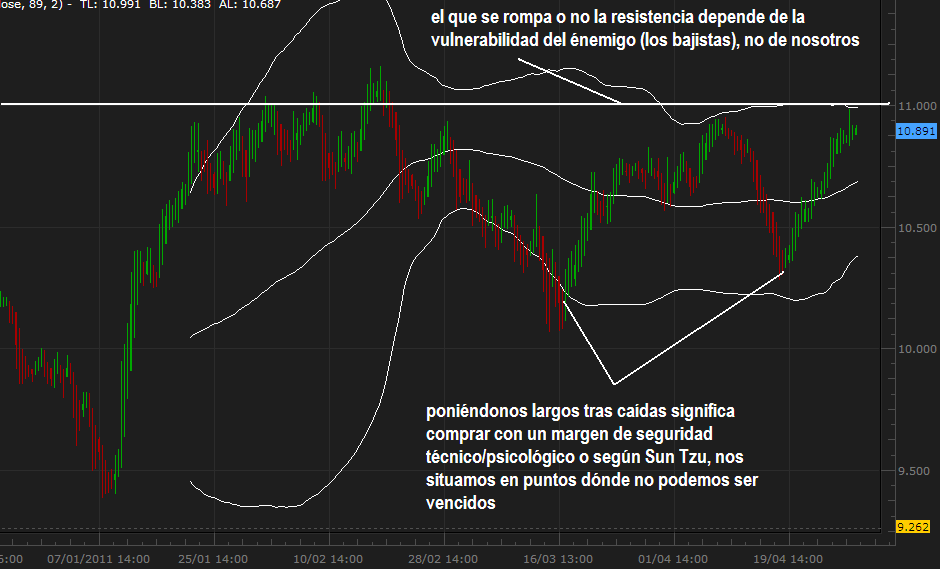 Ponerse largos tras caídas cuando se tiene una visión alcista es hacerlo con un margen de seguridad técnico /psicológico. De esta manera nos aseguramos una posición donde difícilmente el mercado puede vencernos, o en donde la derrota sería muy barata y solo unos pocos peones de nuestras tropas serían ejecutados.