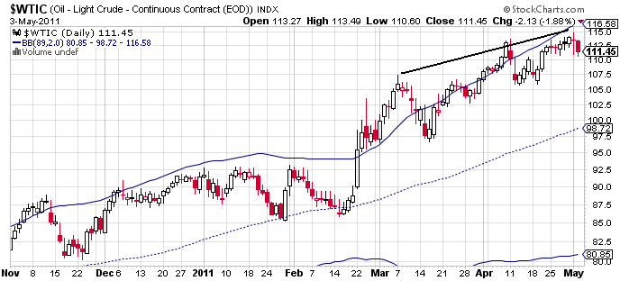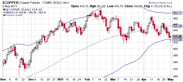 Ayer por la tarde el mercado había caído tras las subidas provocadas por la alegría de la muerte de Bin Laden. Nada anormal, una caida como otra cualquiera. Después fui a observar el gráfico del cobre. El cobre suele ser un indicador coincidente de los mercados. La teoría es sencilla: el cobre es un metal industrial muy utilizado, por tanto que este suba es percibido como bueno para la bolsa. Sea o no verdad o que haya algo de profecía autocumplida, los hechos del pasado muestran que hay cierta correlación. Esto fue lo que vi: