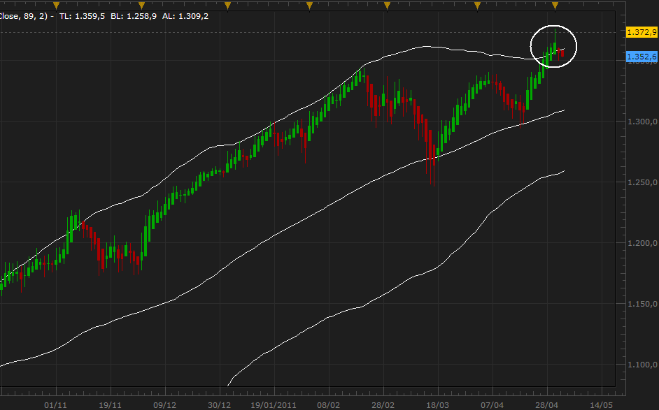 Lo primero de todo es que el precio se encuentra en la parte alta de las bandas de Bollinger. Esto es normal en una tendencia alcista, pero el hecho de que el mercado subiera muy fuerte con la noticia de Bin Laden y luego se diera la vuelta me hizo pensar que tal vez nos encontremos a las puertas de un pequeño pullback o retroceso. Además, con la noticia de Bin Laden se había acumulado de repente mucho optimismo. Y cuando el optimismo aparece yo me salgo. Parece que las velas Heiken Ashi que se están mostrando ahora confirman el potencial pullback o retroceso del precio.