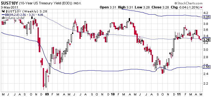 Otro elemento importante es que la rentabilidad de los bonos han formado un doble techo y han empezado a caer (a pesar de lo que diga PIMCO). Esta bajada de la rentabilidad es propio de un proceso de "flight to quality". Incluso en las últimas semanas la histeria con los bonos ha llegado a límites bárbaros, poco menos asegurándose que Estados Unidos va a entrar en default. Lo cierto es que si bien un nuevo ciclo parece que esta cerca, aún seguimos en un entorno de tipos bajos que hace difícil que estos empiecen a ofrecer mayores rentabilidades.