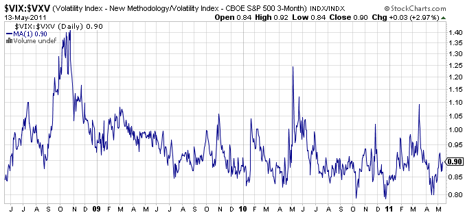 Por tanto, lo único que teníamos claro era que de forma general, este ETN hay que adquirirlo en backwardation. Ahora bien, siempre es mejor que seamos mucho más precisos. Para ello, lo que hacemos es observar el ratio entre el índice VIX (volatilidad a 30 días) y el índice VXV (volatilidad a 90 días):