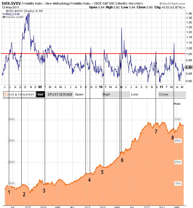 Las líneas negras unen los momentos en que el ratio VIX:VXV llega por vez primera a 1 y el momento en que se dio en el índice SPVXTSER que hipotéticamente es como se tenía que haber comportado el ETN XVIX de haber existido en los último tres años.
