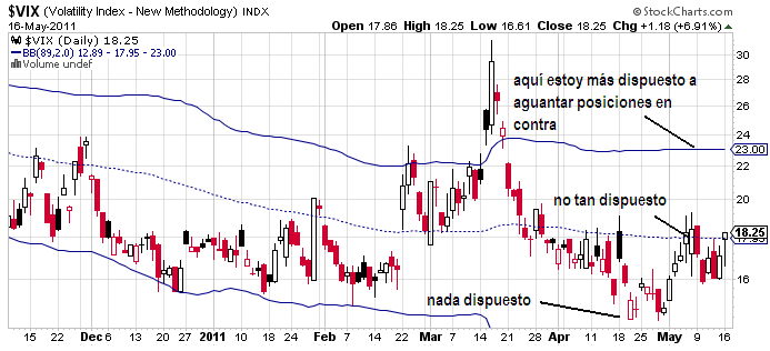 Sé que esto puedo ser chocante a todos los traders dogmáticos que dicen que hay que modular la posición según la volatilidad...y es verdad, yo lo hago pero al revés :-) si la volatildad es baja, y sabiendo que el VIX puede explotar a lo bestia, pues intento mantenerme moderado en mi posición. Si la volatilidad es alta, y como se que el VIX tiende a revertir a la media (con alta probabilidad) estoy más dispuesto a aguantar puntos en contra. Además, si me equivoco, podré revertir las pérdidas en una operación cercana en el tiempo. Normalmente, se dice que es al revés, que con alta volatilidad uno ha de jugar más pequeño y con baja volatilidad uno ha de jugar más grande....pero eso yo no lo entiendo, ya que cuando mayor es la volatildad, menor es el riesgo de que esta siga incrementando.