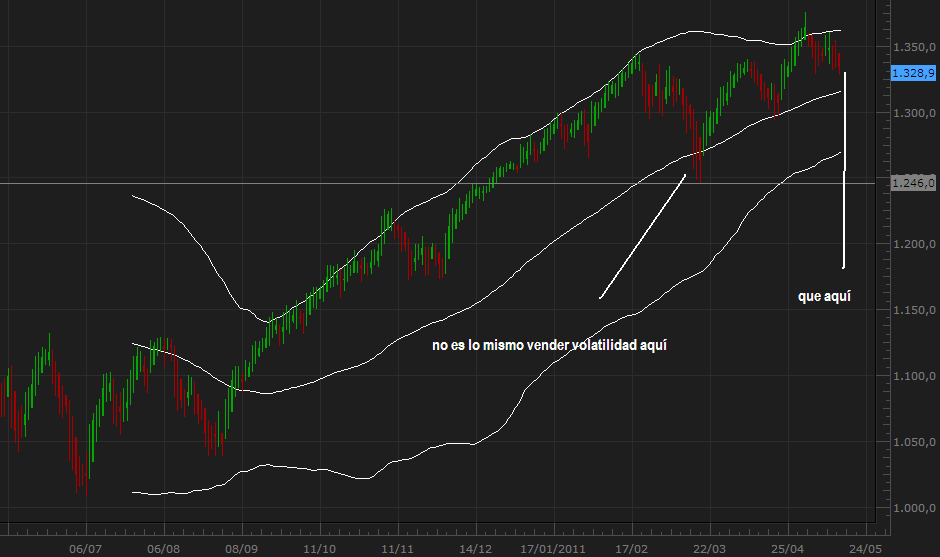 Por otro lado, no es lo mismo vender volatilidad tras un pullback del precio muy fuerte (el pasado crash de Japón) que cuando el S&P 500 se encuentra en máximos, muestra debilidad y parece que quiere caer más (doble techo de muy corto plazo en velas diarias?) y además el análisis global es de mercado lateral.