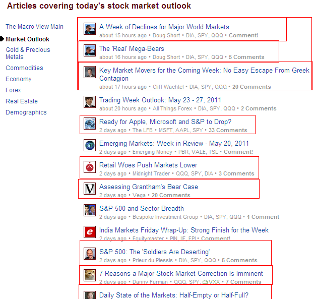 Entiendo que hay cierta "sensación de vértigo" y que se piensa que tras fuertes subidas hay miedo a seguir comprando y vendiendo volatilidad. Pero eso es un defecto que solo sufre el que opera mirando por el retrovisor, no el que opera mirando hacia adelante. Los hechos son los que son, da igual que hizo el mercado ayer. Hoy hay pesimismo. Estas notas sobre el sentimiento vienen reforzadas por los titulares de la sección "Market Outlook" de Seeking Alpha: