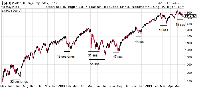 Como se observa, antes de que el mercado reinicie con fuerza un movimiento al alza, muchas veces es necesario esperar alrededor de 20 sesiones (1 mes natural). Esto ocurrió en la corrección del verano de 2009, en la de febrero-marzo de 2010, en dos momentos más de mitad de ese año, en febrero-marzo de 2011 y en el momento actual.