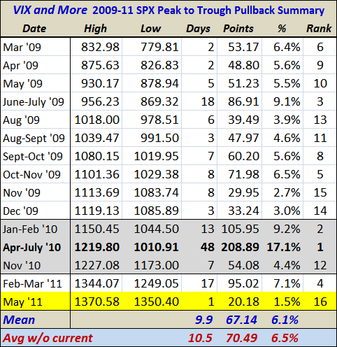 En el presente mercado alcista nacido en marzo de 2009, la media de la duración de las correcciones ha sido de 10 sesiones, pero ciertas correcciones han durado casi 20 sesiones e incluso la más grande corrección de todas desde mayo hasta julio de 2010 duró 48 sesiones o dos meses y medio.