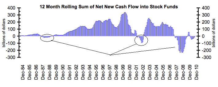 1. El flujo de capitales hacia fondos de renta variable, medidos de forma interanual sigue siendo negativo. Todo a pesar de más de dos años de mercado alcista. Las otras veces que esta lectura fueron tan negativas: después del crash de 1987 y después del mercado bajista de 2000-2002.