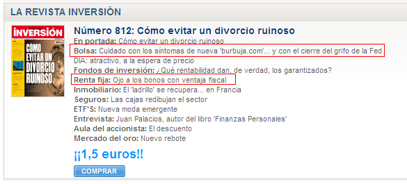 7. La revista "inversión", la cual directamente se puede leer al revés todo lo que dice, alerta en sus páginas de los peligros de la bolsa y habla muy bien de los bonos con ventajas fiscales.