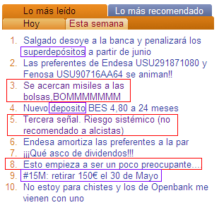5. El sentimiento inversor es muy negativo (todo a pesar de que el mercado ni sube ni cae). Se adjunta imagen de lo más leído esta semana. En rojo tres temas totalmente pesimistas, en recuadros violetas, se muestra que también se habla de depósitos y de retirar dinero del banco (rollo #15m). También se habla de preferentes de una eléctrica...vamos muy lejos de unas "terras".