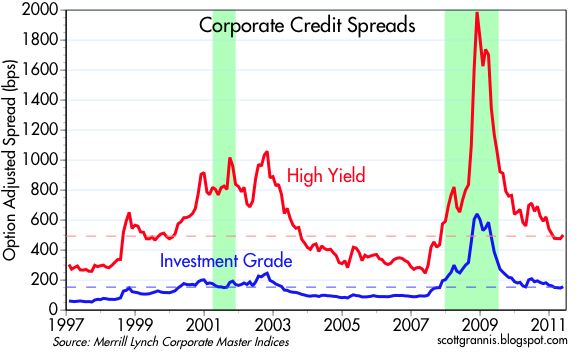 2. Las rentabilidades ofrecidas tanto por los bonos de mejor calidad (investment grade) como por los bonos basura (high yield), siguen en niveles propios de un mercado pesimista y bajista (por encima líneas de puntos)