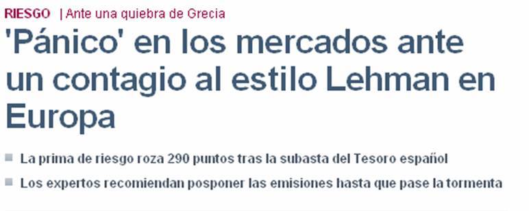 9º El mercado cae y cae y cae. Tu cuenta muestra pérdidas. No hay alcistas. Los titulares se escriben a tamaño 30. Los comentarios corren a patadas por los periódicos online. El fin del mundo está cerca. Greecia, que es un país enano para el mundo es la causa del cataclismo financiero, el dólar está a punto de deparecer, el oro es el único refugio y se recomienda a la gente sacar el dinero del banco.