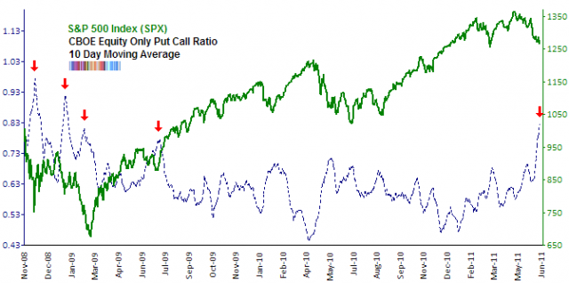El ratio put/call, el cual es bastante limitado y falla mucho, pero que es útil cuando muestra lecturas muy extremas...está disparado a niveles parecidos a los del fin del mercado bajista de 2008-2009.