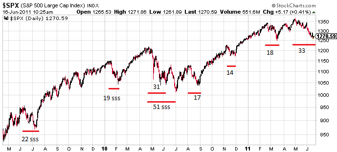 Como se observa, estamos en el segundo retroceso de mayor duración del presente mercado alcista, y el primer retroceso en duración que no haya tenido un rebote del 5% en medio (como en junio de 2010). Por tanto, no es un retroceso cualquiera, y sí bastante importante. Cuando los retrocesos son de amplia duración, es cuando los alcistas se evaporan con más fácilidad, pues el elemento temporal va haciendo mella en ellos.