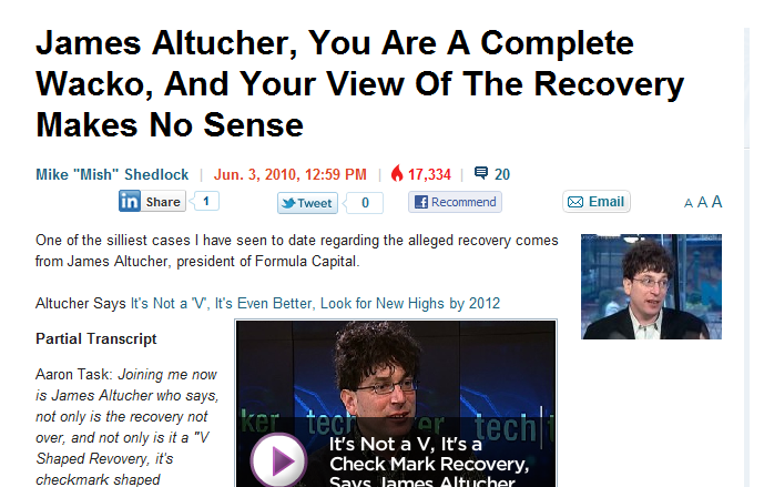 (Noticia de Business Insider donde el payaso Mish Shedlock insulta a James Altucher por decir que la economía y la bolsa subiría: y subieron)