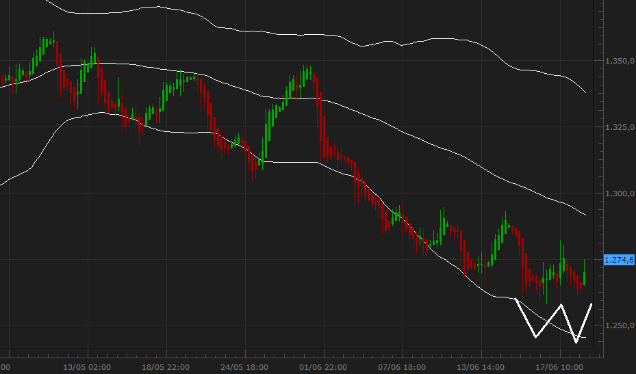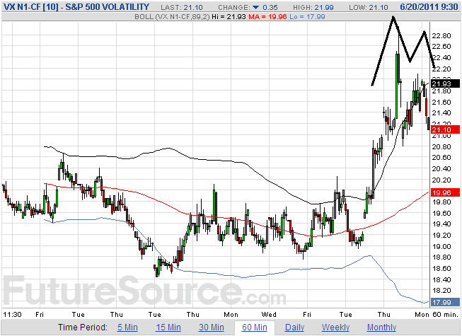 Este lunes, el mercado parece querer formar una figura de estabilización (un doble suelo regular en 4 horas) a la vez que un doble techo en el futuro del VIX (gráfico horario). Ambos elementos me han invitado a insistir en la venta de volatildad. La salida se ejecutará si el mercado rompe mínimos.