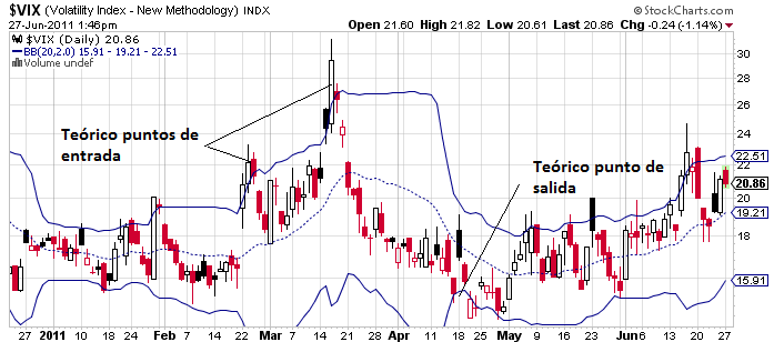 Si en el VIX entramos básicamente por que detectamos un "revesal" en la banda superior de Bollinguer, pues la salida será cuando el VIX llegue a la banda inferior.