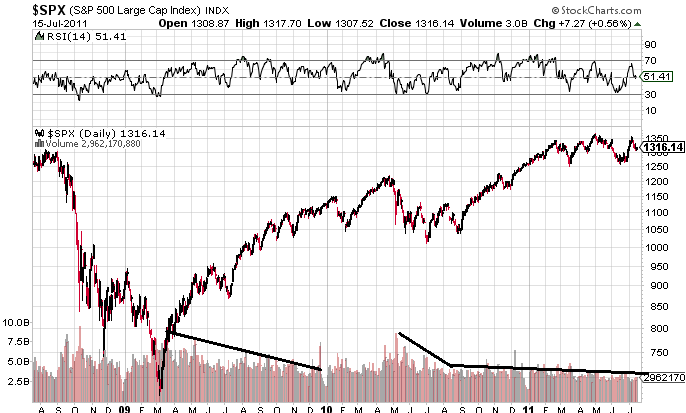 También Kostolany habla del volumen en términos opuestos a lo aceptado como convencional. Para él un alto volumen siempre significa que las manos débiles estan dirigiendo el mercado. Cuando el mercado cae y hay fuerte volumen, significa que las manos débiles se deshacen de los títulos y "los duros" se hacen con esas gangas. Cuando el mercado sube y hay fuerte volumen significa que estamos en la fase final de un movimiento al alza ya que el público, es decir, las manos débiles, están excitadas comprando algo que ya había subido mucho. Un movimiento al alza con poco volumen es lo saludable por que significa que son los duros los que están comprando el mercado. Justo lo que aquí decimos. Sin embargo, el chartismo, como tantas otras cosas, ha intercambiado la verdad por las mentiras y nos dice que el volumen ha de acompañar al movimiento. ¿Habrá cosa más falsa?