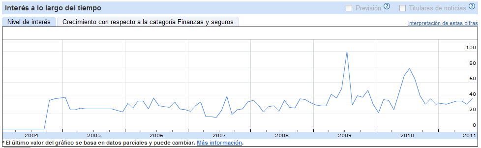 Y sin embargo ¡el público no habla de ello! Fíjense en el chart de Google Insight, en la primavera de 2009 y en el verano de 2010 los HCH s eran parte del sentimiento de la masa...sin embargo el actual y muy claro HCH no llega ni a 40 en la herramienta de google. Asi que alerta. De momento estoy en liquidez y esperando acontecimientos.