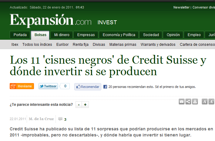 Algunos argumentarán que igual no es sorpresivo para ellos (Credit Suisse) pero sí para nosotros, por tanto aunque para ellos no es un Cisne Negro para nosotros sí. Pero he aquí el error conceptual. Desde el momento en que algo desconocido para mi deja de serlo por que alguien me ha avisado, es imposible que sea un Cisne Negro por que ha perdido el factor sorpresa. Si a posteriori ocurriese ese evento no será una sorpresa. Es como que mi novia me haya advertido de que me están haciendo una fiesta sorpresa de cumpleaños.