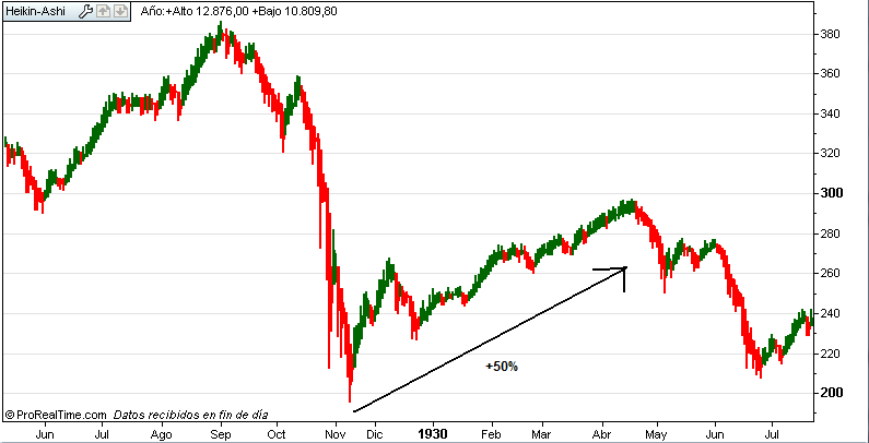 El rebote fue del 50% desde mínimos y duró 7 meses. Si uno tuvo la capacidad de comprar más o menos abajo pudo aprovechar una gran oportunidad. ¿Qué el mercado después siguió cayendo? Bueno, eso no significa que uno tenga que perder. A lo mejor hasta acaba ganando si se sale a tiempo. Es la suerte de ser un oportunista y saber comprar abajo. En el artículo "La naturaleza del riesgo" hablamos de ello, de que lo arriesgado es comprar una vez el precio ha subido y que lo conservador es comprar cuando el precio está en su peor momento. Sí, lo se, no es lo que usted leerá por ahí, pero yo he perdido mucho dinero hasta que entendí eso. Hágase un favor y métase eso en la cabeza, no espere a comprobarlo con su propio dinero.